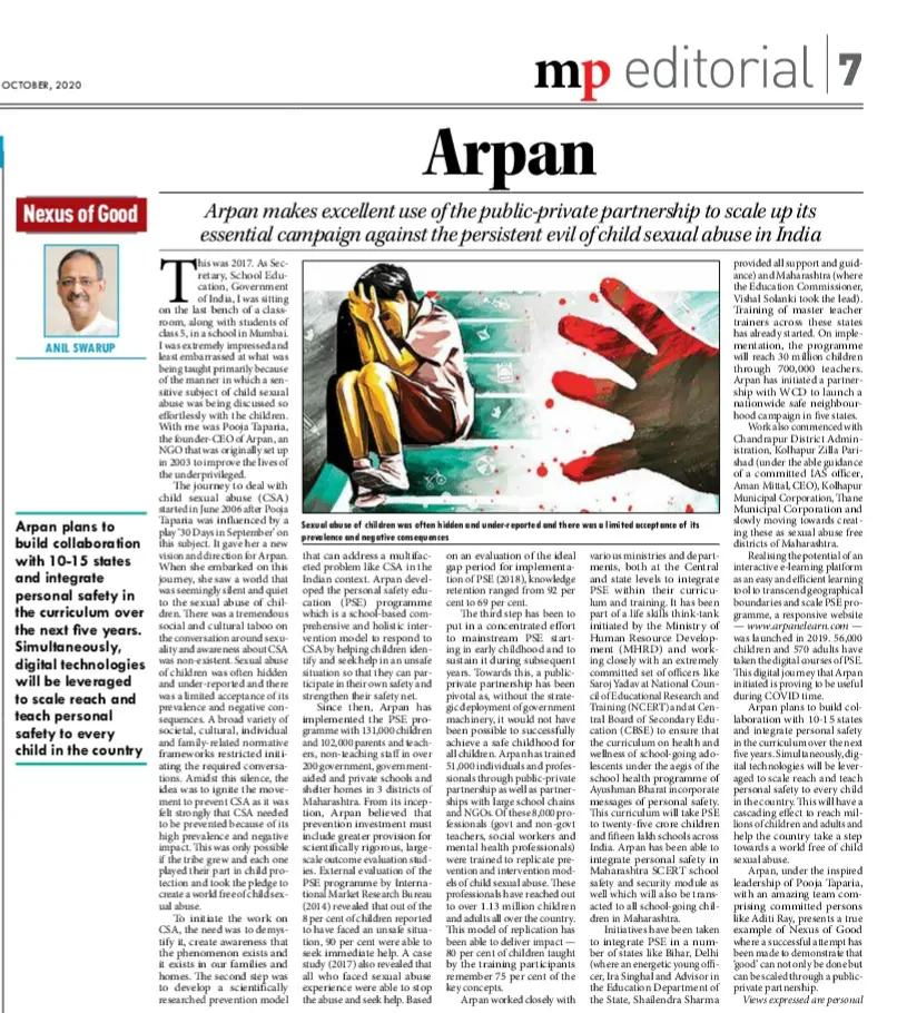 Arpan Makes Excellent use of the public-private Partnership to Scale up its essential campaign against the persistent evil of child sexual abuse in India