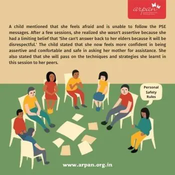 The child reported feeling confident to be able to be assertive. She also stated that she would now share the techniques and strategies that we discussed in our sessions with her friends. She wanted to equip them with similar assertive techniques for any unsafe situations. She also shared how she felt more comfortable and safe in asking her mother for help. The mother also reported saying that she was noticing these differences in the child’s behavior. The mother felt lesser need to constantly guard her or keep a check on her as the child herself had started being more open about her daily activities.