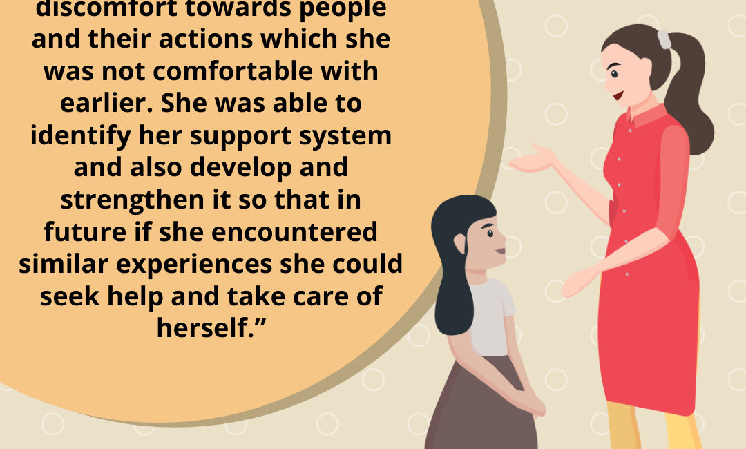 During the therapy process, enough time was spent in understanding safe and unsafe touches through psycho education and therapeutic activities. Over a period of a few sessions the counsellor developed a good rapport with the girl and the girl trusted the counsellor enough to share her experiences with a 35 year old married father of two children. This man was touching the girl and had also kissed her. Since the girl felt deprived of care, attention and love from her family, she had started liking it when it was provided by this middle aged man and misunderstood it to be love. In therapy the counsellor through psycho education explained to the girl about safe and unsafe touches, Child Sexual Abuse, worked on maintaining boundaries in relationships and also explained about grooming. Through therapy the child learnt assertive skills in expressing discomfort towards people and their actions which she was not comfortable with earlier. She was able to identify her support system and also develop and strengthen it so that in future if she encountered similar experiences she could seek help and take care of herself. Through relaxation and other techniques she could work on her feelings of fear. In the process the girl herself informed her trusted adult and received help. The child has been able to come out of the situation and has coped with her emotional issues as well. The counsellor also had sessions with the girl’s trusted adult and helped her create a safety net for the child.